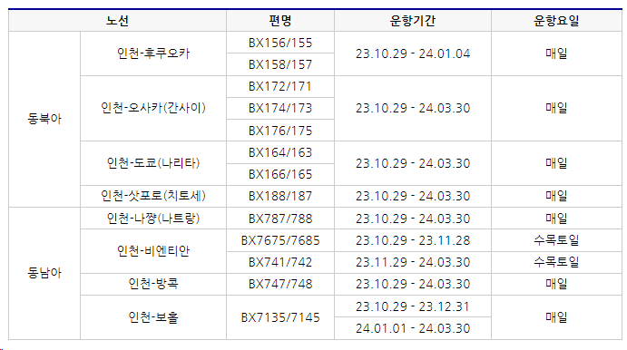 ※ 상기 운항 스케줄은 2023년 10월 05일 기준입니다.