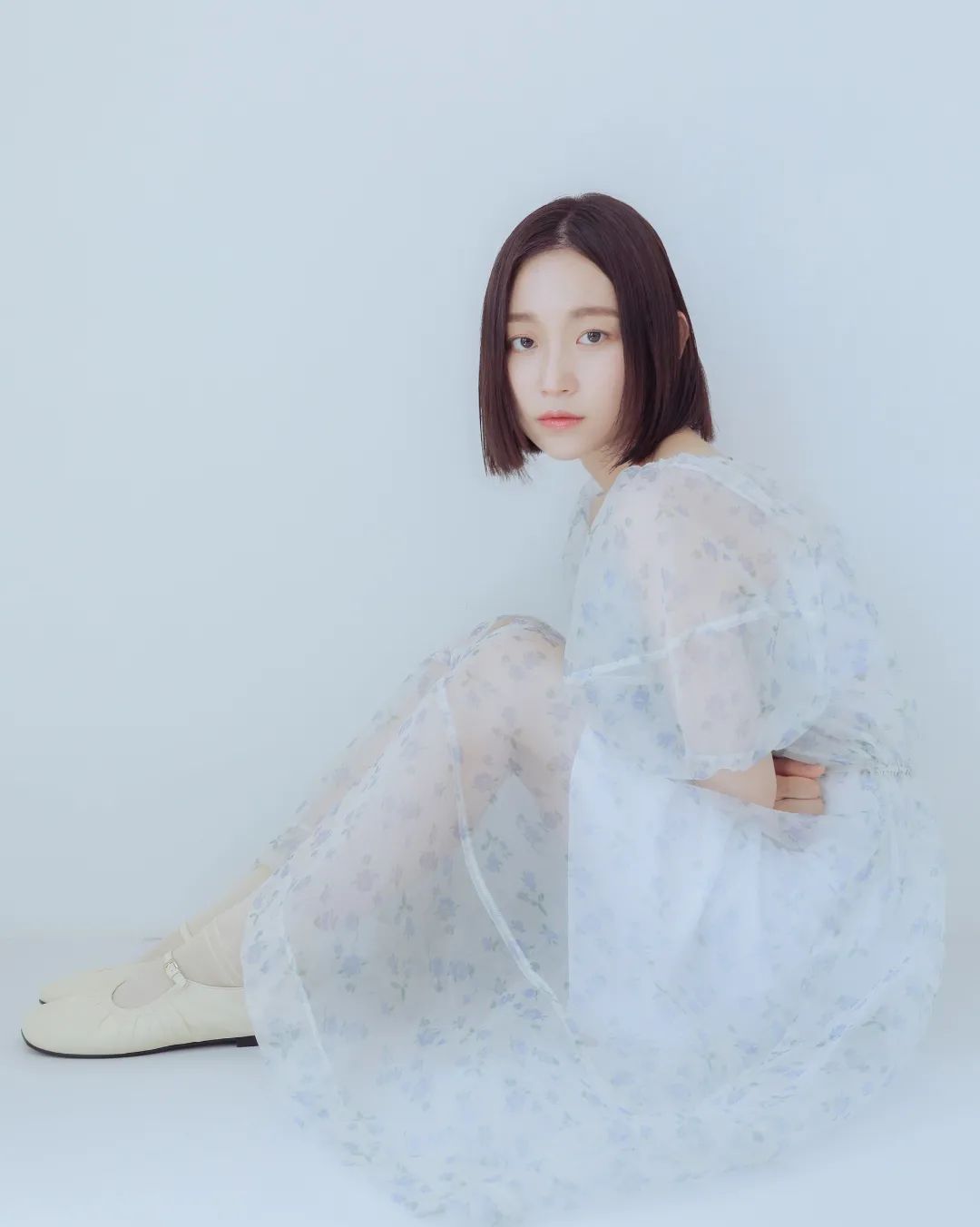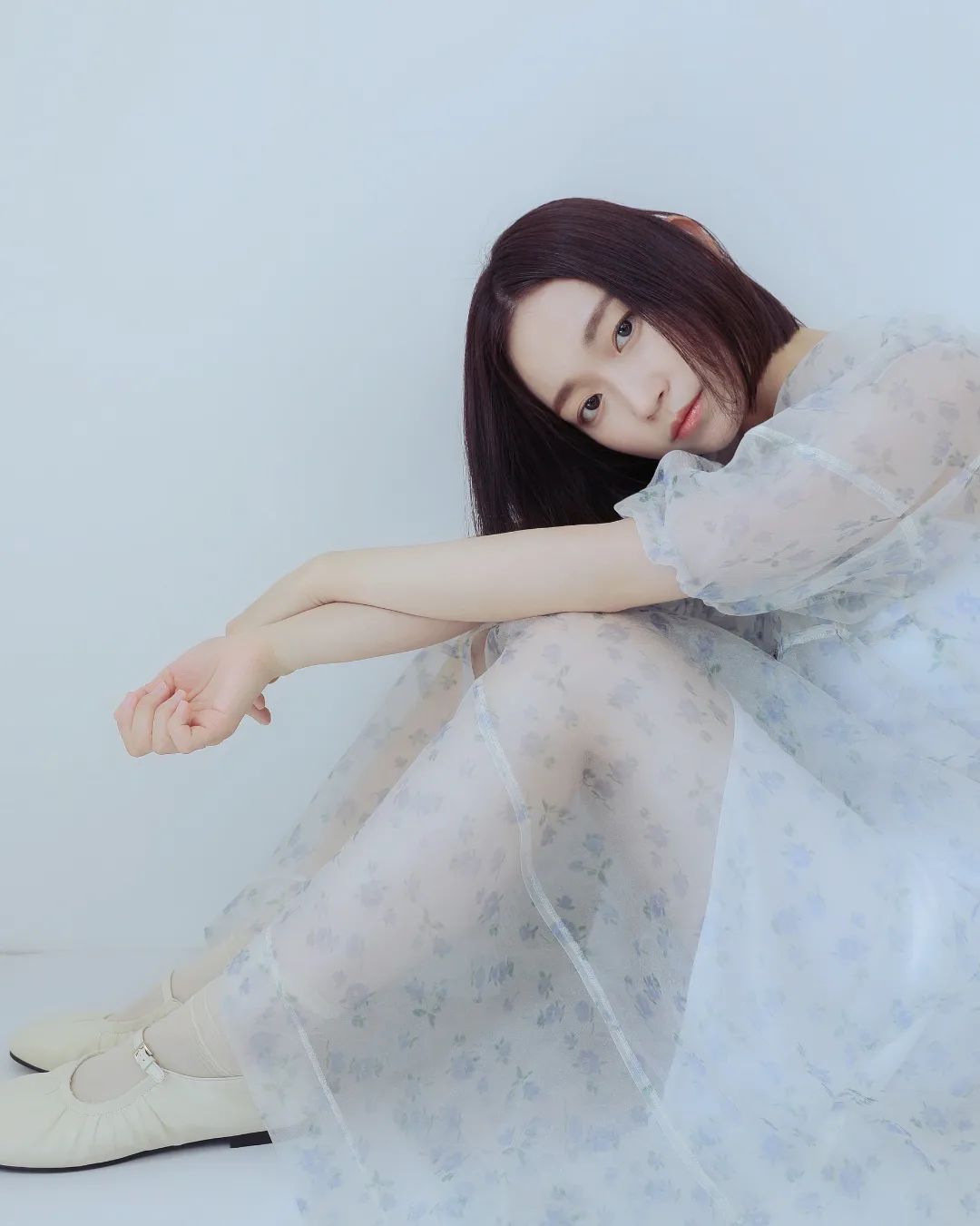 하늘색의 옅은 꽃무늬 장식이 원피스의 포인트인듯 하다.